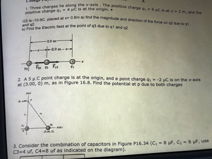 Solved Three Point Charges Lie Along The X Axis As Shown In Figure Below The Positive Charge Q1 15 0 C Is At X 2 00 M The Positive Charge Q2 6 00 Pc Is